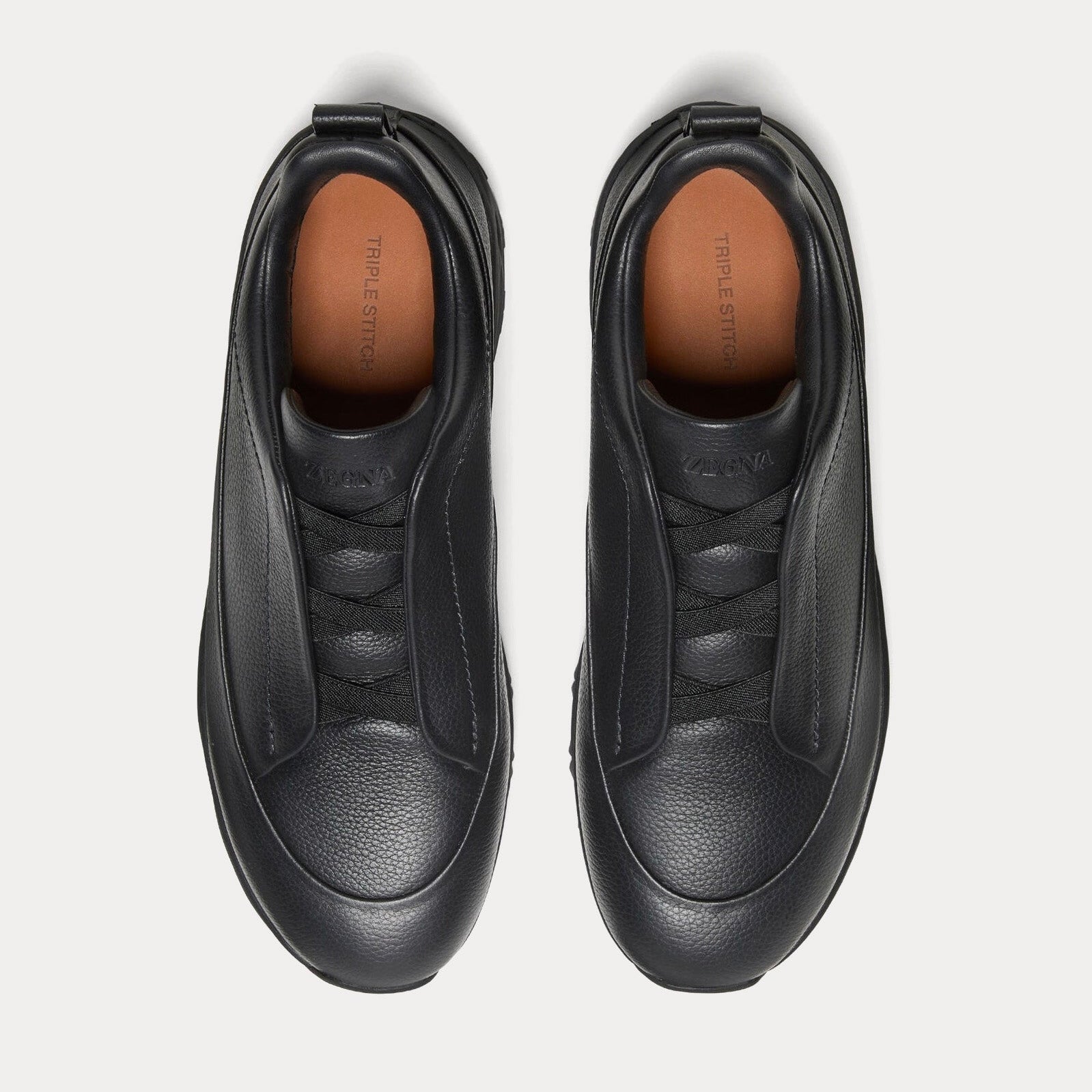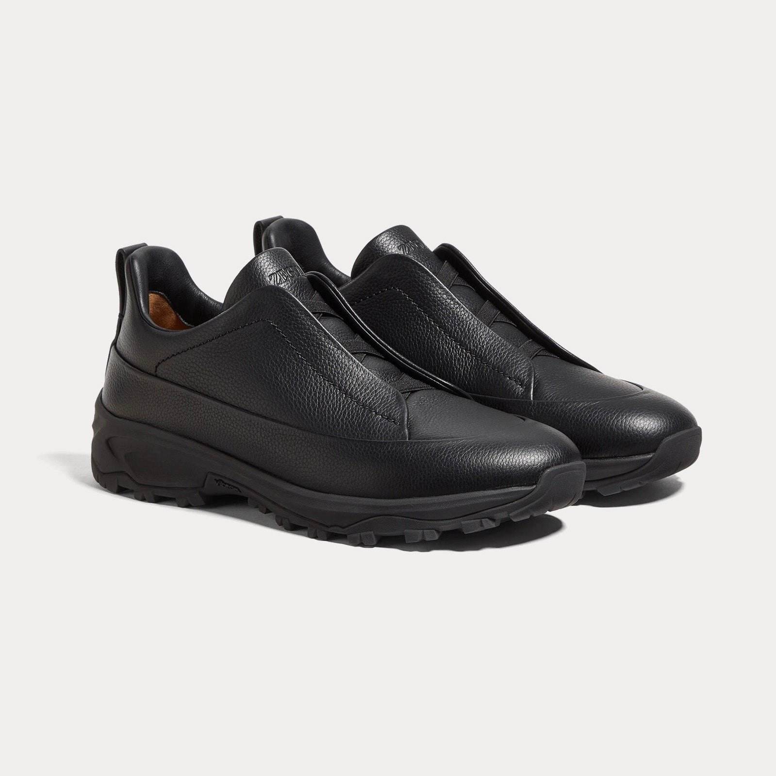 The men’s Zegna Triple Stitch Monte slip-on sneakers in Grained Calf Leather Black fuse modern elegance with year-round reliability through Italian craftsmanship. Built from black grained calf leather, these low tops feature Zegna’s hallmark triple-crossed elastic detailing for an easy slip-on fit, inspired by the traditional hand-stitching of the brand’s tailoring. The Foliage-colored leather lining, signature 232 Road Brand Mark on the heel tab, and advanced Vibram Arctic Grip All Terrain sole highlight both luxury and outdoor readiness.
